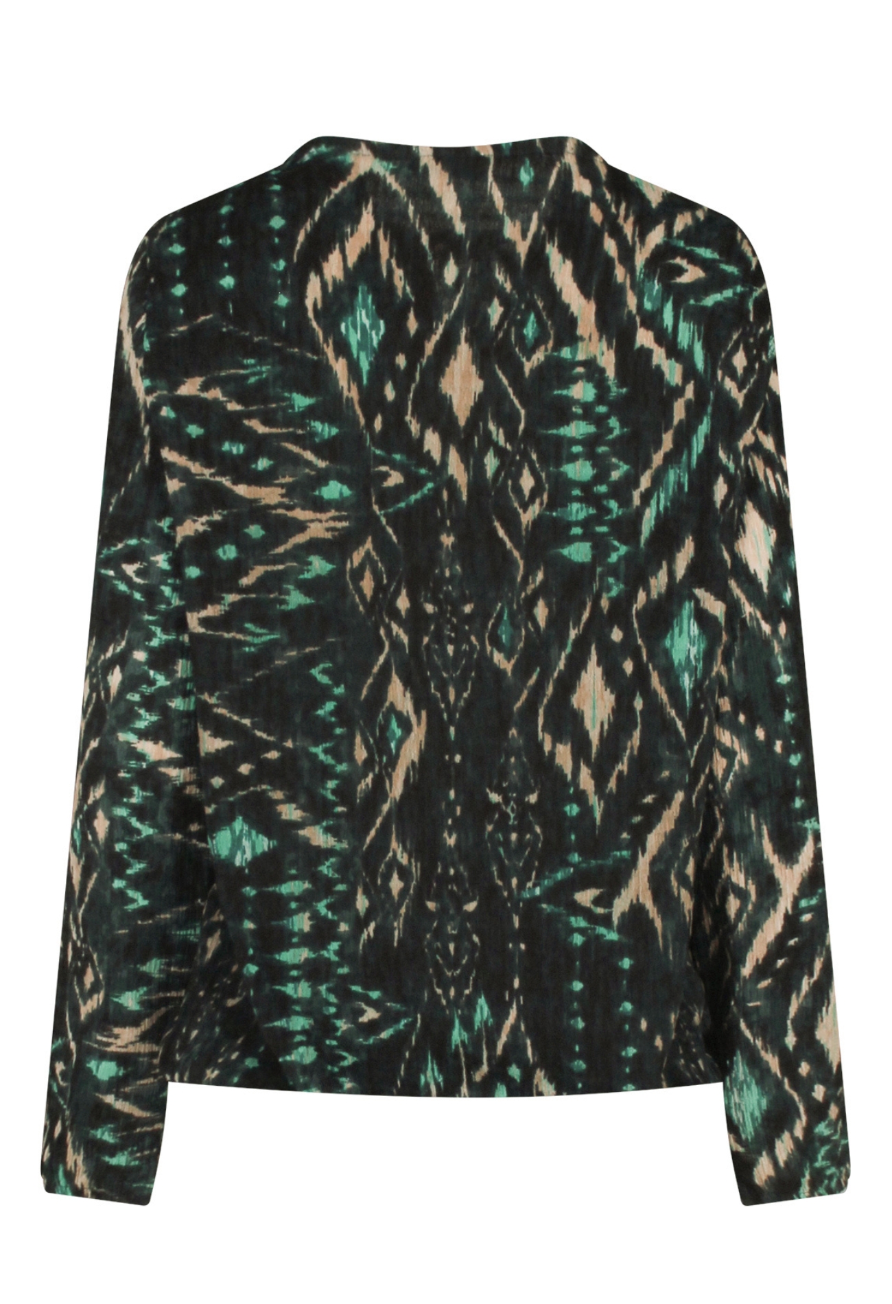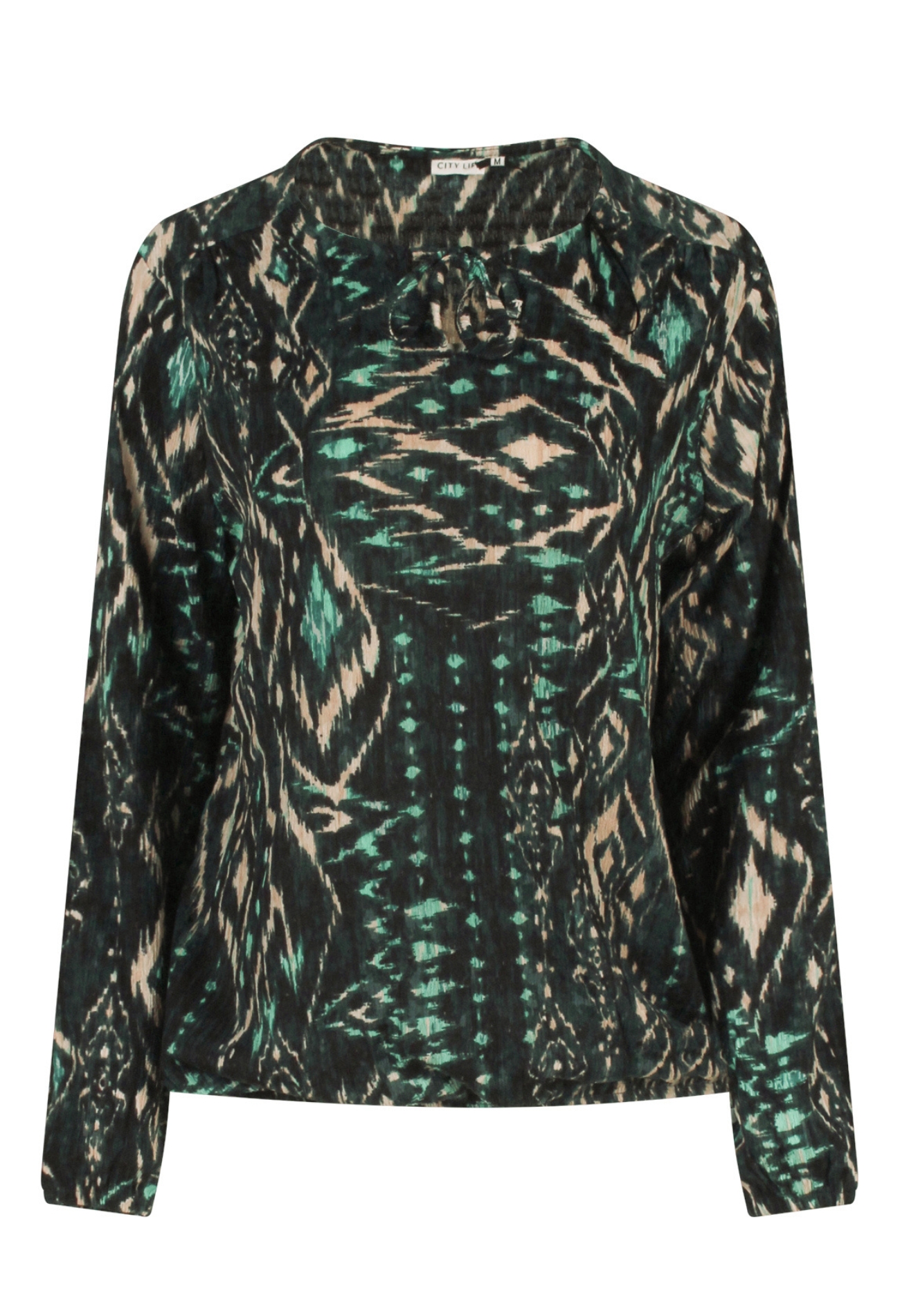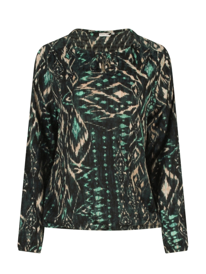 Deze kleurrijke top heeft een kleine inkeping voorop welke boven bij de hals sluit met een koordje. Hou je er van om je shirt een beetje te laten bollen? Goed nieuws! Dit shirt heeft zowel bij de pols als in de taille een elastiek. Makkelijk te combineren met rokken en jeans.