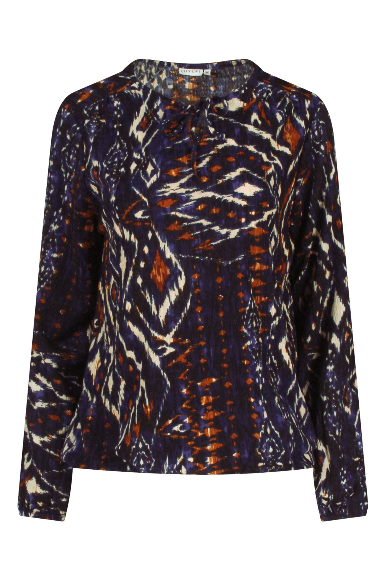 Deze kleurrijke top heeft een kleine inkeping voorop welke boven bij de hals sluit met een koordje. Hou je er van om je shirt een beetje te laten bollen? Goed nieuws! Dit shirt heeft zowel bij de pols als in de taille een elastiek. Makkelijk te combineren met rokken en jeans.