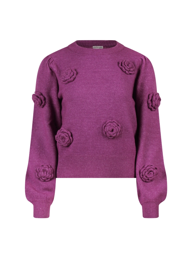 Deze gebreide damestrui is een echte eyecatcher dankzij de sierlijke opgestikte bloemen en de elegante pofmouwen. Het speelse design geeft je outfit een romantische twist, terwijl de zachte knit zorgt voor een comfy fit. Draag hem op een jeans voor een casual look met een vrouwelijke touch, of combineer met een rok voor een meer geklede stijl.