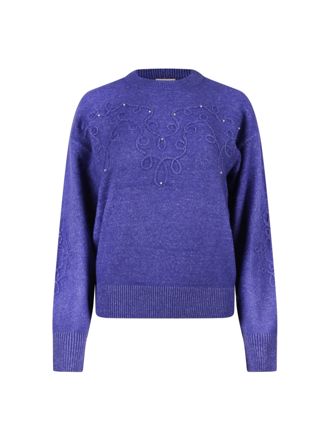 Deze heerlijk warme damestrui is gebreid van een zachte kwaliteit en afgewerkt met sierlijk opgestikt lint, dat zowel aan de voorkant als op de mouwen terugkomt. Her en der zijn kleine parels toegevoegd voor een subtiele glans en vrouwelijke touch. Perfect om te dragen op een jeans voor een cosy, maar elegante look met oog voor detail.
