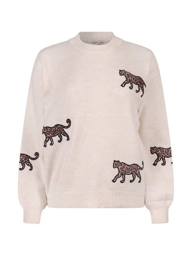 Deze gebreide trui is een echte eyecatcher dankzij de panterapplicaties op de voorkant van de trui en lopen door op de mouw. De combinatie van zachte knitwear en stoere details zorgt voor een opvallende, maar draagbare look. De achterkant is rustig gehouden, zodat de focus echt op het frontdesign ligt. Leuk op een jeans of coated broek voor een speelse, modische twist.