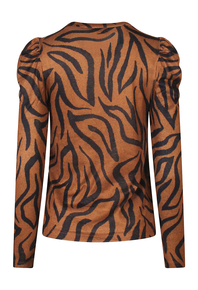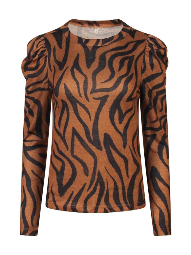 Dunne gebreide top met opvallende zebra print. Met een pofmouwtje. Leuk te combineren met een giletje of blazer.