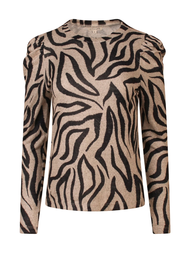 Dunne gebreide top met opvallende zebra print. Met een pofmouwtje. Leuk te combineren met een giletje of blazer.