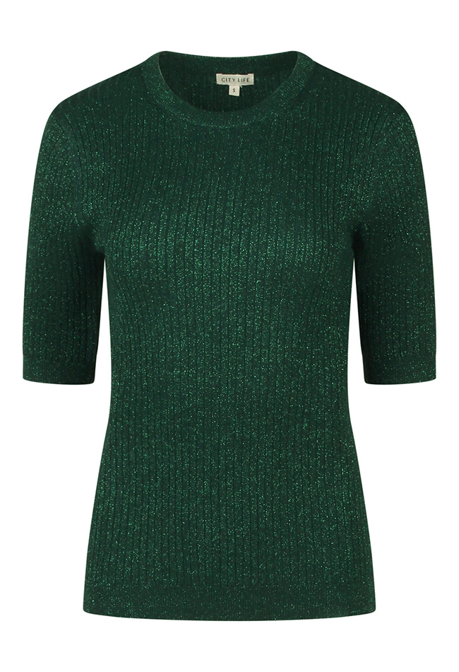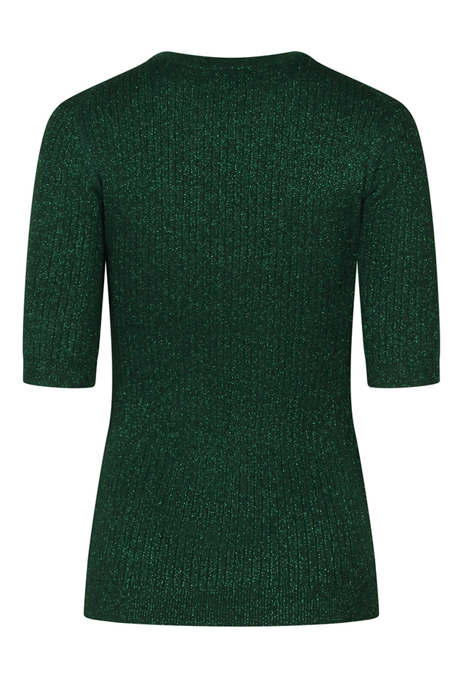 Dit ribgebreide shirt met korte mouw is de perfecte mix van comfort en feestelijke flair. Dankzij de subtiele lurexdraad krijgt het shirt een sprankelende glitter die het net dat beetje extra geeft. Draag ?m op een jeans voor een casual-chique look of combineer met een rok voor een feestelijke outfit. Ideaal voor de feestdagen of een avondje uit!