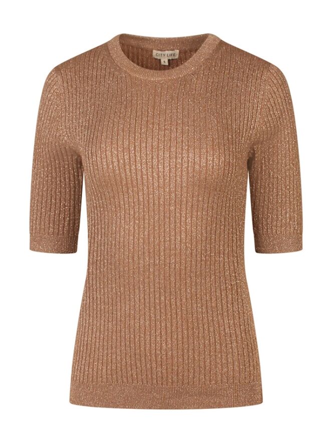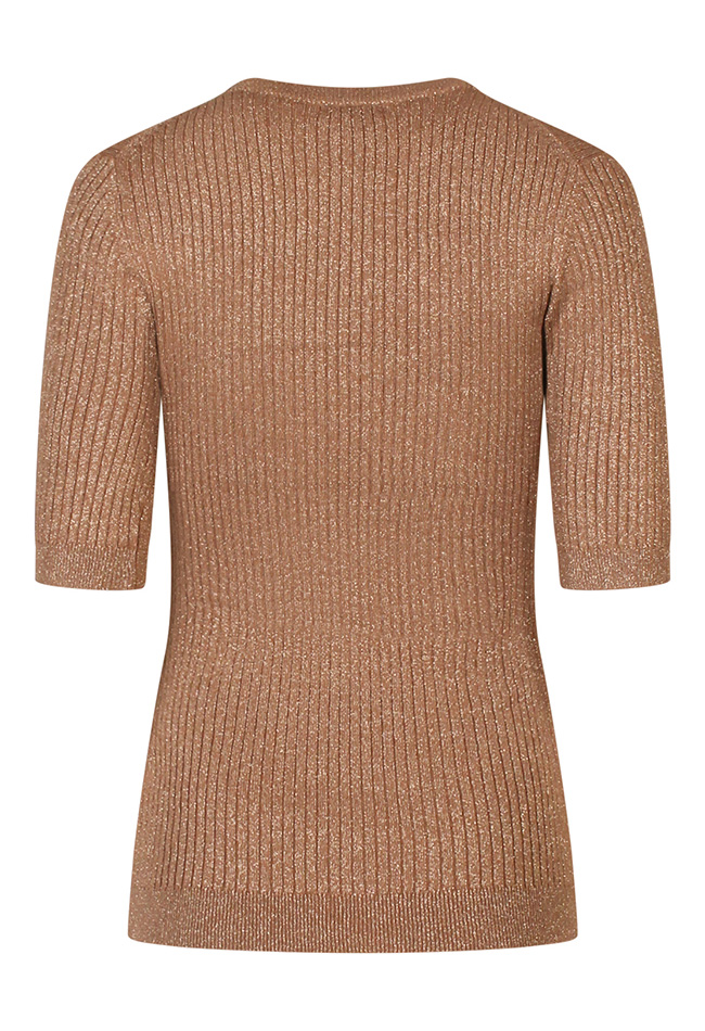 Dit ribgebreide shirt met korte mouw is de perfecte mix van comfort en feestelijke flair. Dankzij de subtiele lurexdraad krijgt het shirt een sprankelende glitter die het net dat beetje extra geeft. Draag ?m op een jeans voor een casual-chique look of combineer met een rok voor een feestelijke outfit. Ideaal voor de feestdagen of een avondje uit!