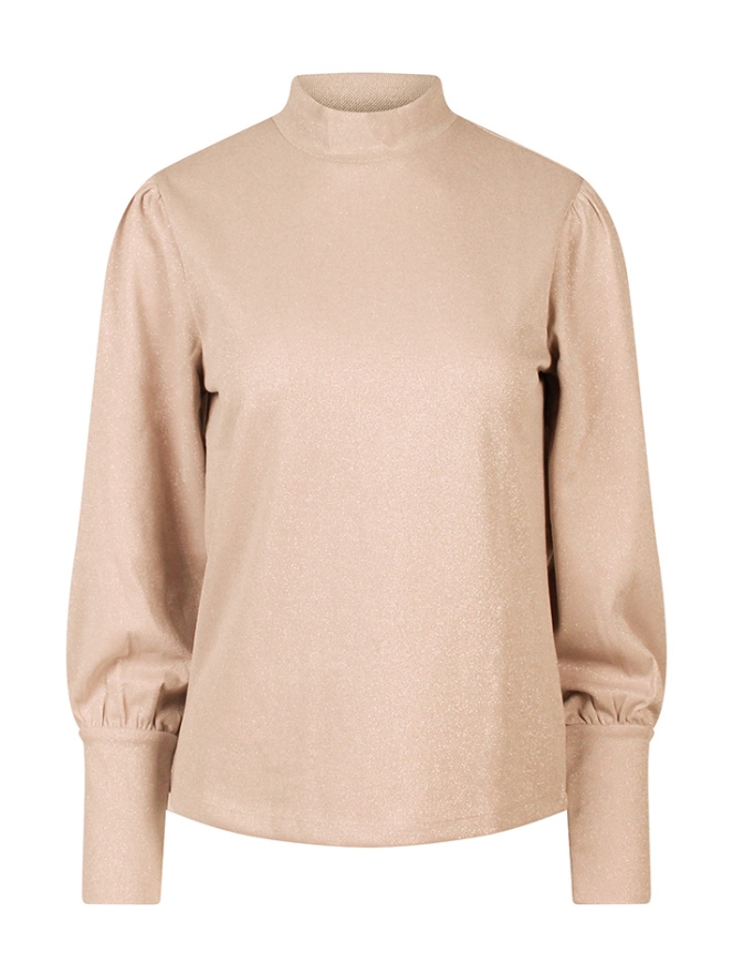 Deze dames top combineert een zachte polyestermix met een subtiele metallic glans, waardoor ?ie nét dat beetje extra heeft. De turtleneck en speelse pofmouwen geven de top een trendy, vrouwelijke uitstraling. Perfect om te dragen onder een blazer of gewoon op een jeans voor een chique, feestelijke look.