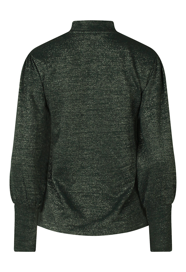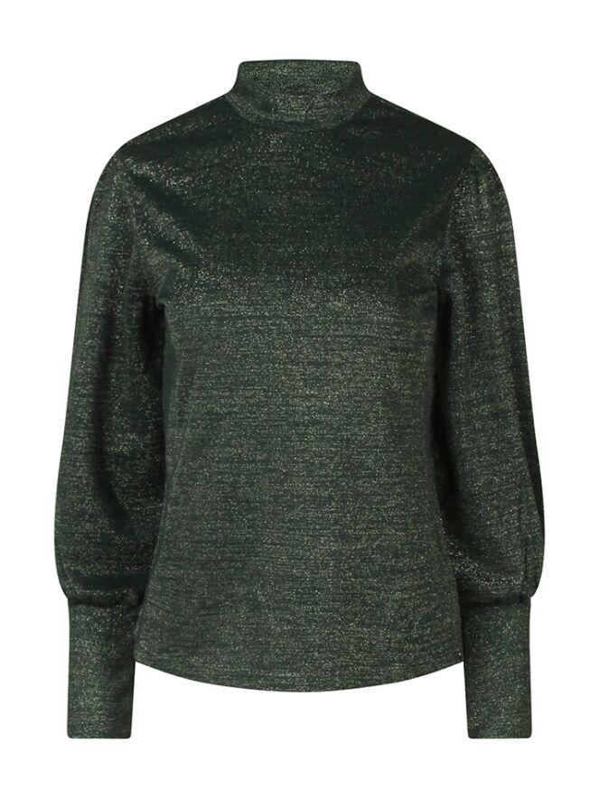 Deze dames top combineert een zachte polyestermix met een subtiele metallic glans, waardoor ?ie nét dat beetje extra heeft. De turtleneck en speelse pofmouwen geven de top een trendy, vrouwelijke uitstraling. Perfect om te dragen onder een blazer of gewoon op een jeans voor een chique, feestelijke look.