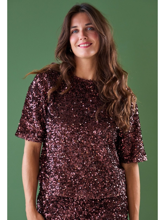 Deze top met halve mouw is gemaakt van zachte velvet en versierd met glinsterende pailletten voor een stijlvolle, feestelijke uitstraling. De comfortabele pasvorm maakt hem perfect voor speciale gelegenheden. Combineer met de bijpassende kokerrok (W10516) voor een complete, elegante look.