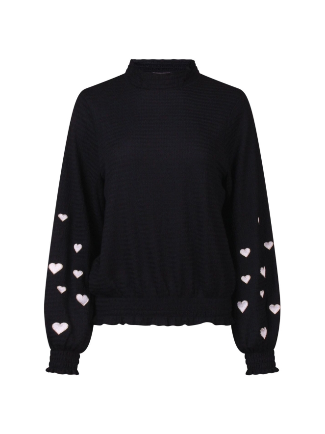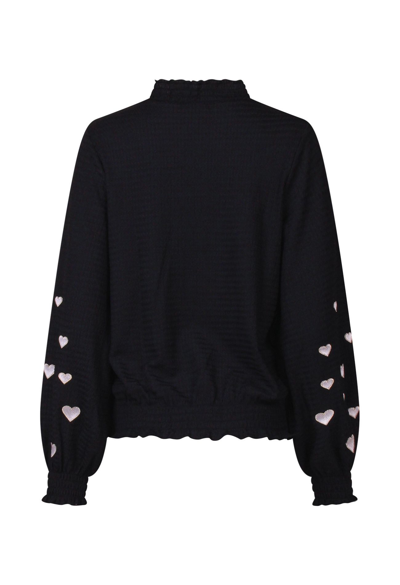 Deze luchtige dames top van crinkle stof is perfect voor een effortless look met net dat beetje extra. De mouwen zijn afgewerkt met een lief hartborduursel en een gesmockt detail dat ook terugkomt in de zoom,voor een subtiele, vrouwelijke touch. Combineer hem met een jeans, rok of short: deze top doet het allemaal.