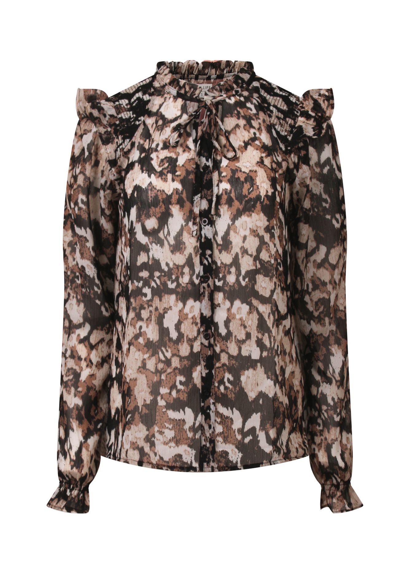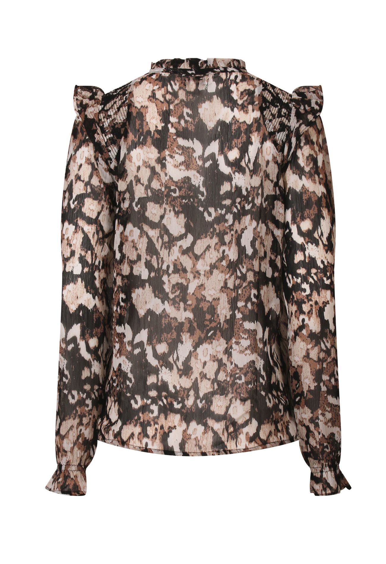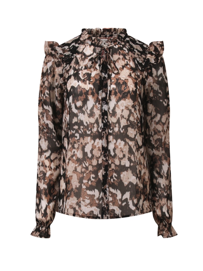 Prachtige dunne licht doorschijnende blouse van So Soire. Deze blouse heeft vele details zoals ruches rond de hals en op de schouder, smockwerk op de schouder, kleine V hals met een koordje en een opvallende print.