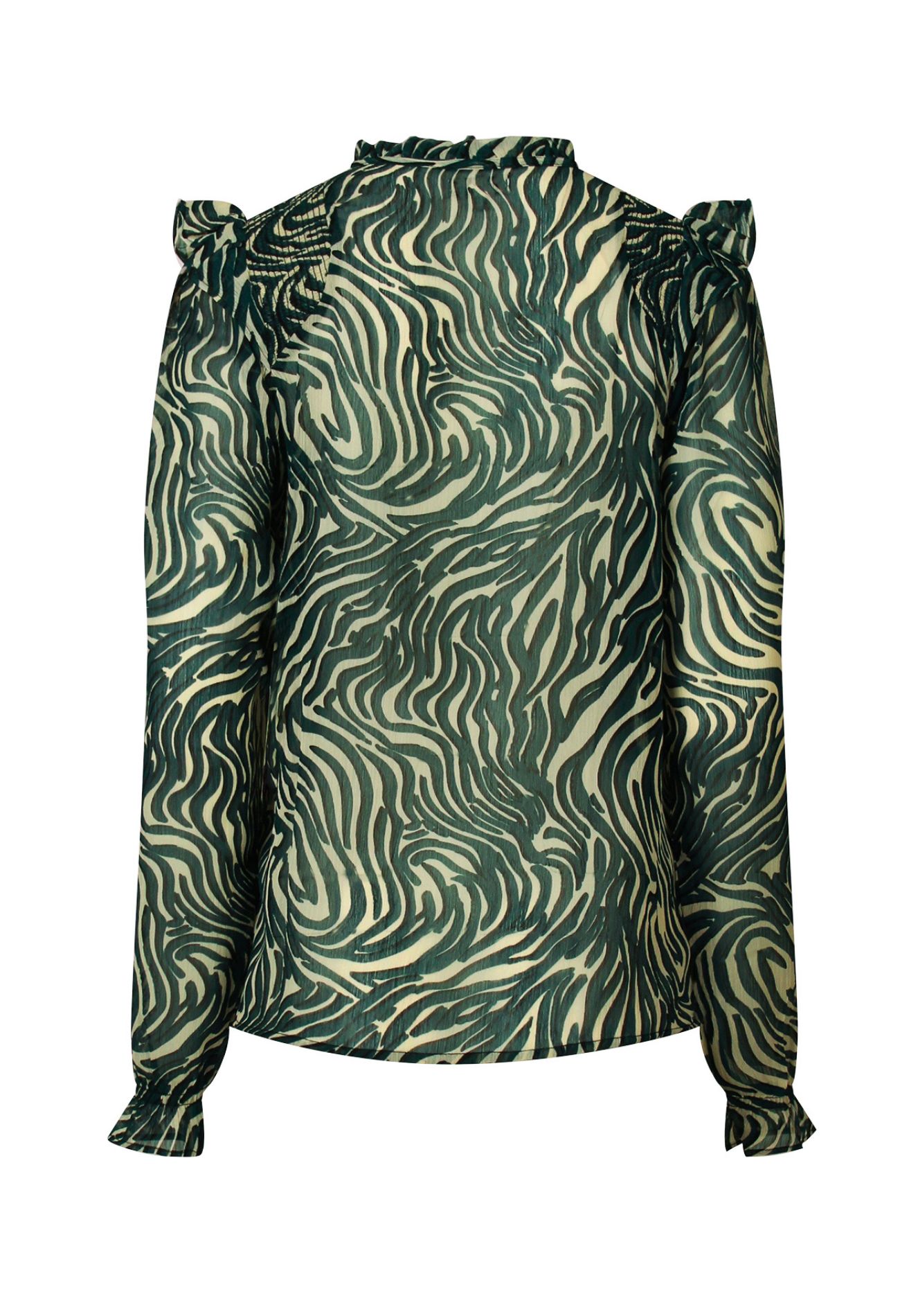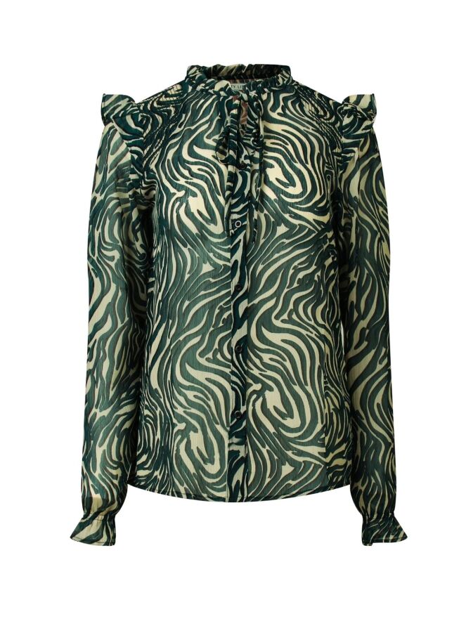 Prachtige dunne licht doorschijnende blouse van So Soire. Deze blouse heeft vele details zoals ruches rond de hals en op de schouder, smockwerk op de schouder, kleine V hals met een koordje en een opvallende print.