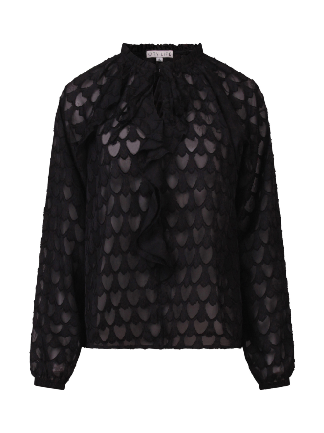 Deze luchtige damesblouse is helemaal on-trend met haar subtiele hartjesprint in de stof en speelse ruches aan de voorkant. De pofmouwen met elastiek in de zoom geven een vrouwelijke touch, terwijl de ruffel langs het voorpand zorgt voor extra flair. Combineer hem met een high-waisted jeans voor een casual chique look, of draag hem op een rok voor een romantische twist.
