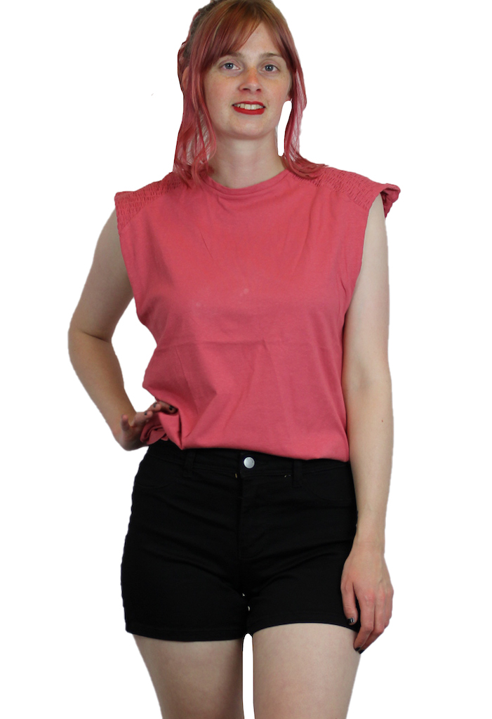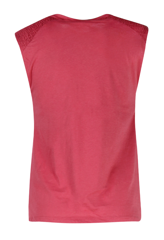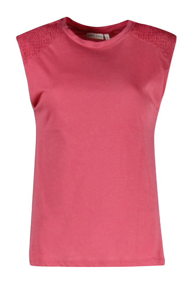 T-shirt van City Life. Het t-shirt heeft geen mouwen en gesmockte schouder vulling. Valt losjes. Materiaal: 100% katoen. Wassen op 30 graden, niet bleken, niet in de droger, kan gestreken worden.