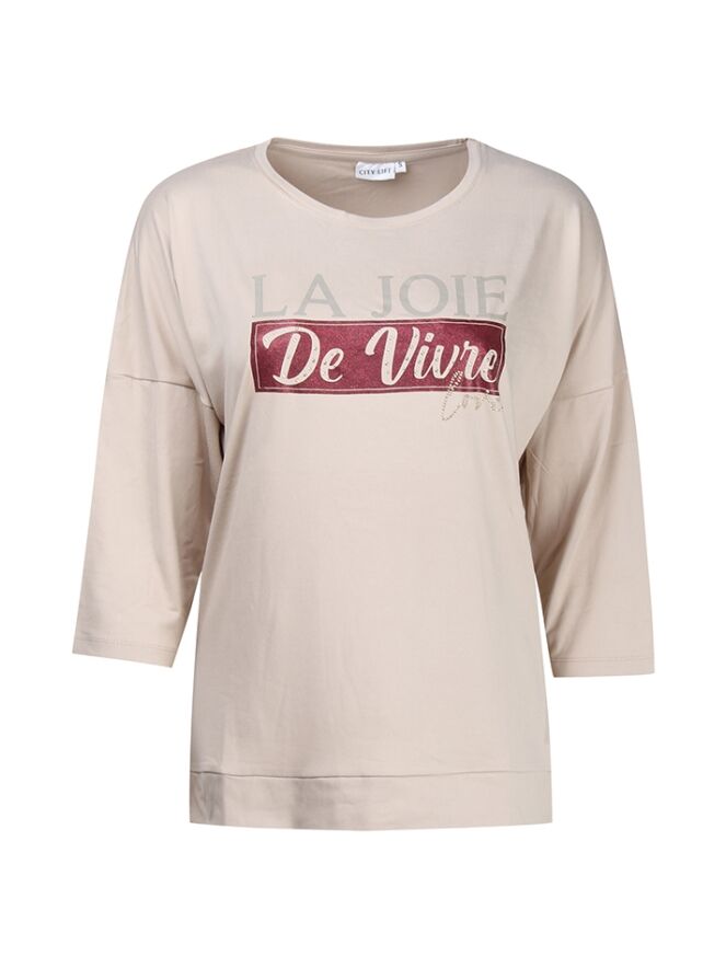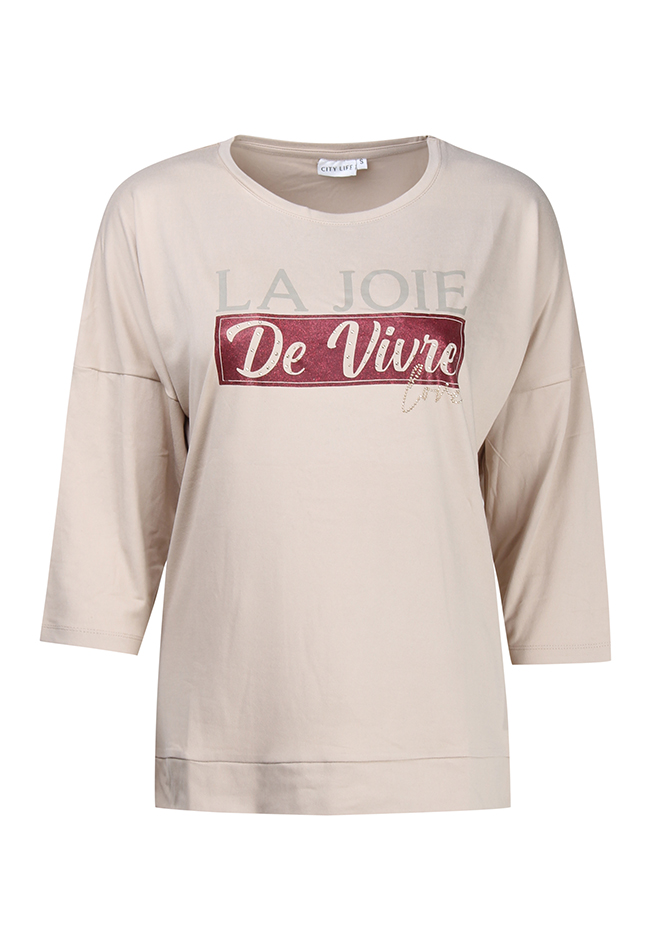 T-shirt met lange mouw van City Life. Het t-shirt heeft 3/4 lengte mouwen en een glitter tekst met strass steentjes op de voorkant. Valt groot. Materiaal: 95% polyester, 5% elasthan. Wassen op 30 graden, niet bleken, niet in de droger, kan gestreken worden.