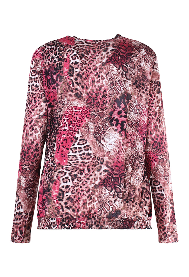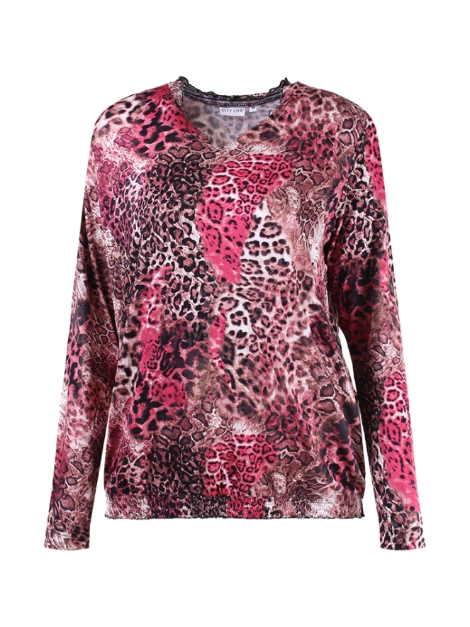 T-shirt met lange mouw van City Life. Het t-shirt heeft een all over print en smock details bij de hals en de onderkant van het shirt. Valt groot. Materiaal: 95% viscose, 5% elasthan. Wassen op 30 graden, niet bleken, niet in de droger, kan gestreken worden.