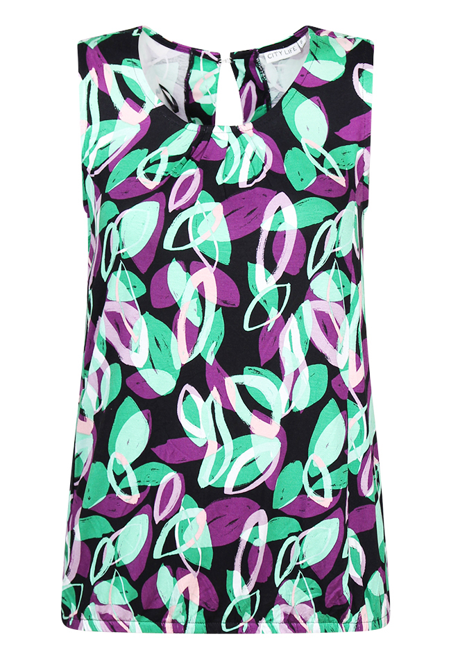 Top van City Life. Dit shirt zonder mouwen heeft een ronde hals voor en een elastiek onderaan. Met een allover blad design.