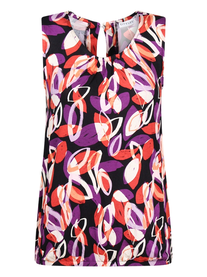 Top van City Life. Dit shirt zonder mouwen heeft een ronde hals voor en een elastiek onderaan. Met een allover blad design.