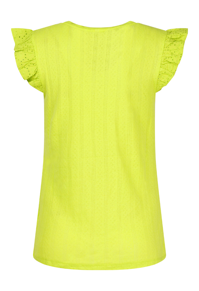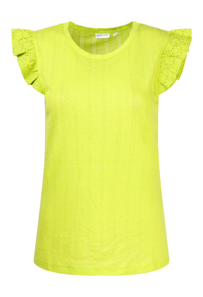 T-shirt met korte mouw van City Life. Dit shirt heeft een ronde hals en vlindermouwen met ruche van broderie. Dit shirt heeft veel stretch door de jersey ajour stof.