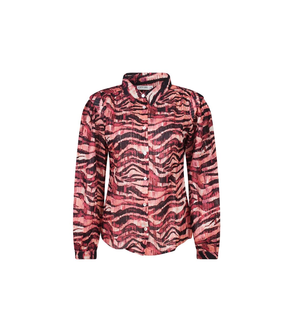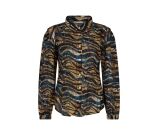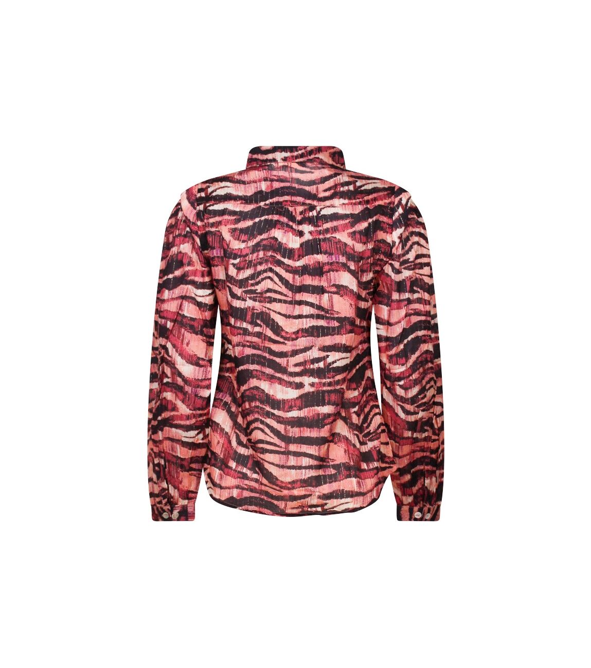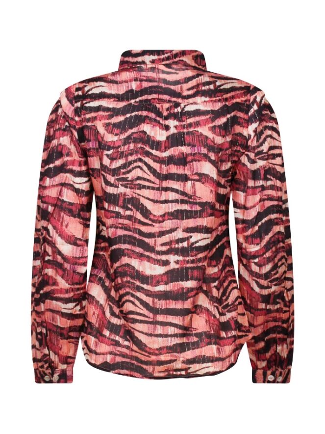 Getailleerde blouse met een all-over zebra print, verweven met subtiel lurexdraad voor een vleugje glamour. Deze blouse heeft een kraagje en wordt aan de voorkant gesloten met knopen. De blouse heeft een pofmouw/kap mouw. De manchet is verstelbaar met twee knoopjes. Een lichte rimpel op de schouder aan de voorkant voegt een elegant detail toe aan deze stijlvolle blouse.