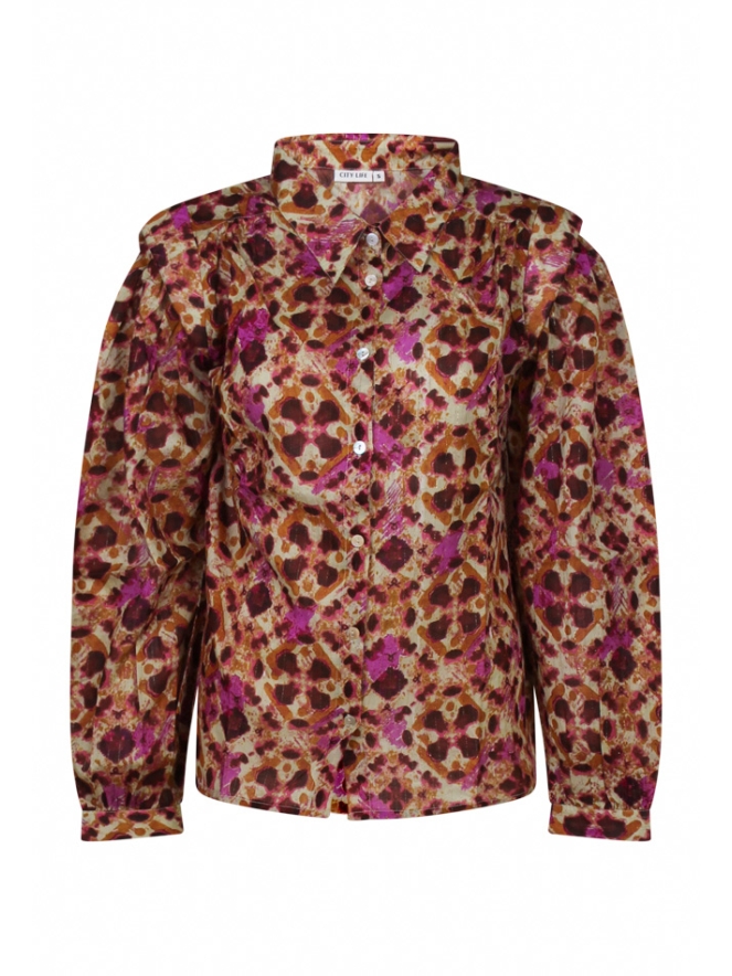 Getailleerde blouse met een all-over grafisch retro vlekkenprint, verweven met subtiel lurexdraad voor een vleugje glamour. Deze blouse heeft een kraagje en wordt aan de voorkant gesloten met knopen. De blouse heeft een pofmouw/kap mouw. De manchet is verstelbaar met twee knoopjes. Een lichte rimpel op de schouder aan de voorkant voegt een elegant detail toe aan deze stijlvolle blouse.