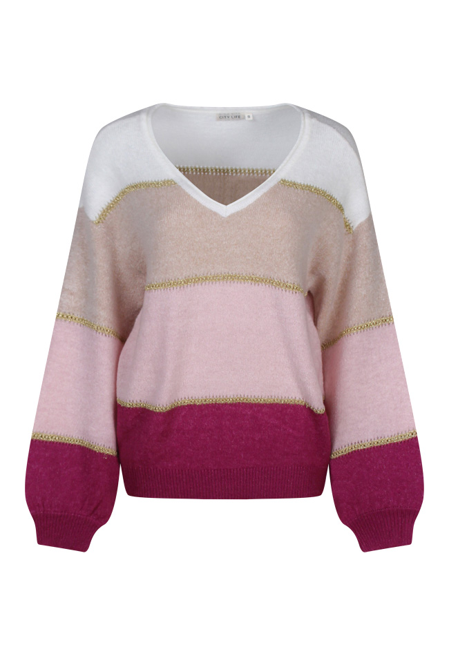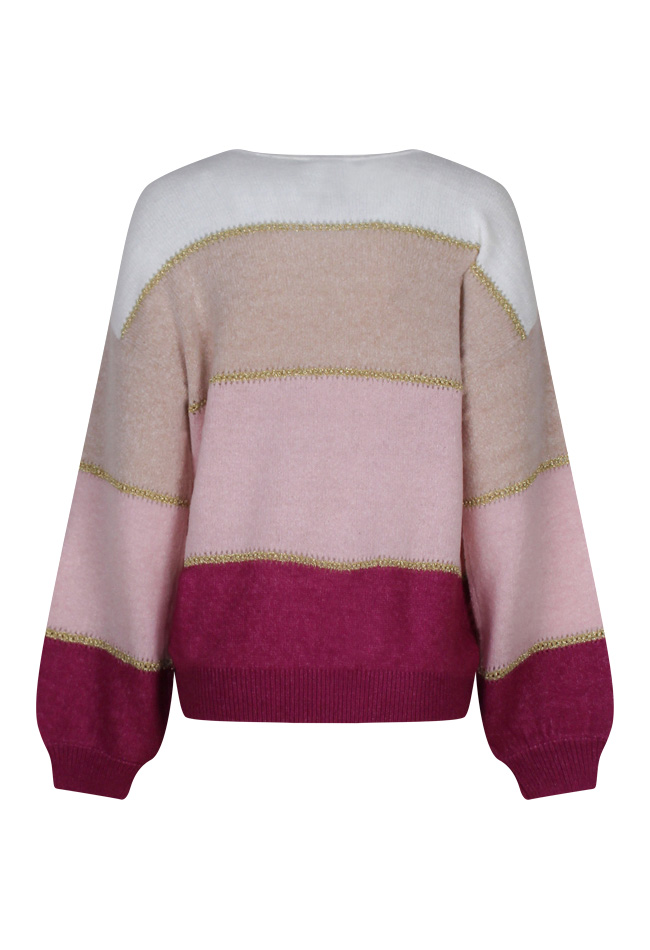 Deze trui heeft een V-hals en is een ruimvallend model. In de trui zitten goudkleurige doorschijnende ajour randen verwerkt.