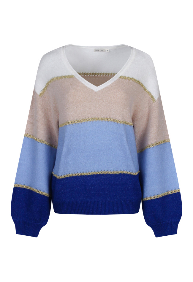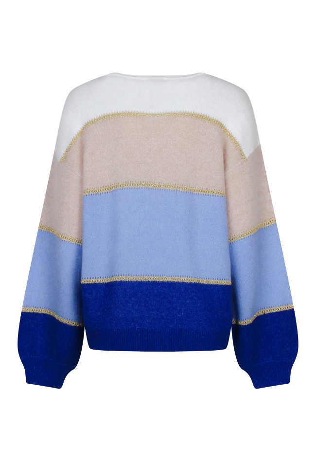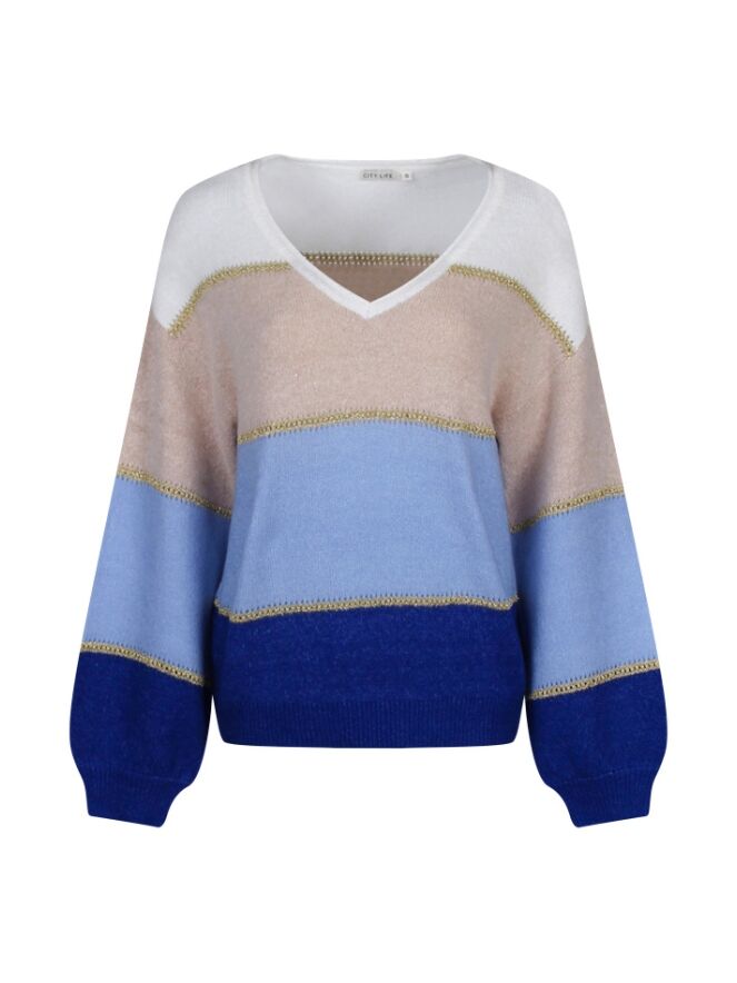 Deze trui heeft een V-hals en is een ruimvallend model. In de trui zitten goudkleurige doorschijnende ajour randen verwerkt.