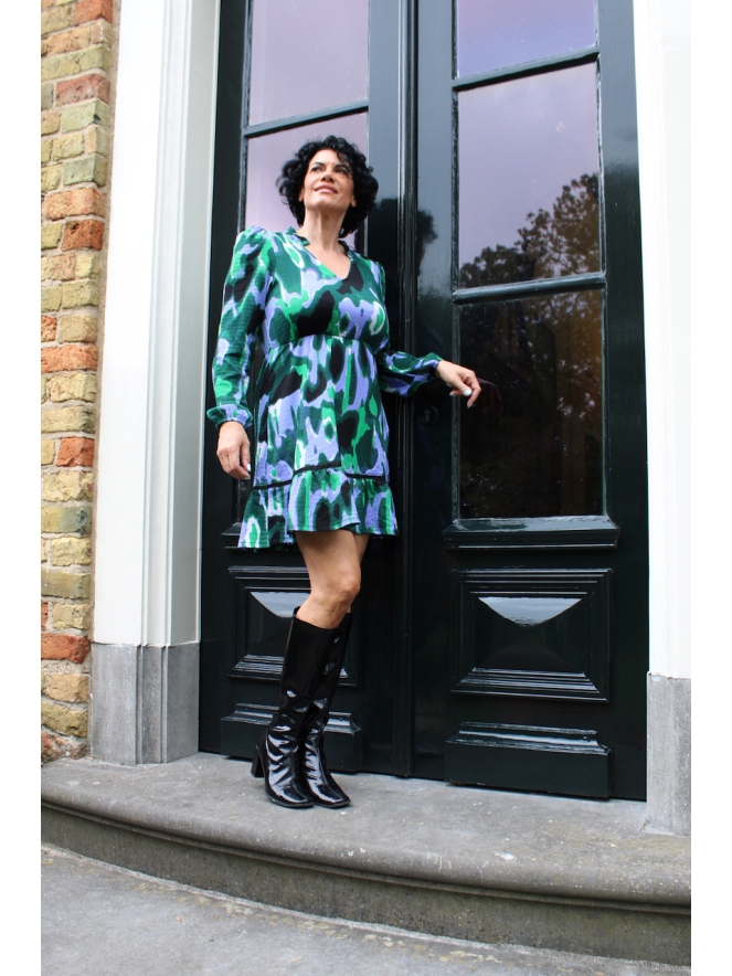 Dit jurkje heeft een aquarel design met mooie heldere kleuren. In de taille zit een elastiek voor een plooi effect.
