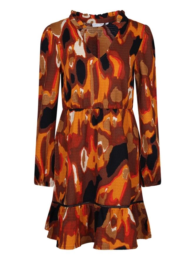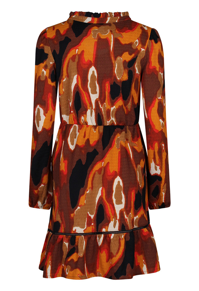 Dit jurkje heeft een aquarel design met mooie heldere kleuren. In de taille zit een elastiek voor een plooi effect.