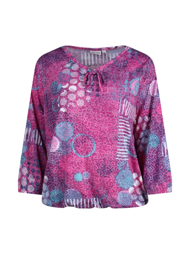 Deze damestop heeft een rondjes design en een koordje bij de hals. Onder bij de middel zit een elastiek, net als aan heet uiteinde van de mouwen.