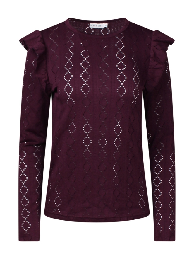 Voeg een vleugje elegantie toe aan je garderobe met deze ajour gebreide top voor dames. Het ontwerp met lange mouwen en een ronde hals zorgt voor een verfijnde uitstraling, terwijl de ruche schouders een speelse, moderne touch geven. Deze top ideaal voor zowel casual als iets chiquer gelegenheden. Combineer met een stijlvolle broek, casual jeans of elegante rok.