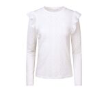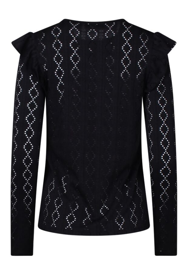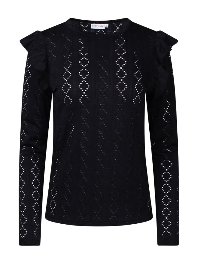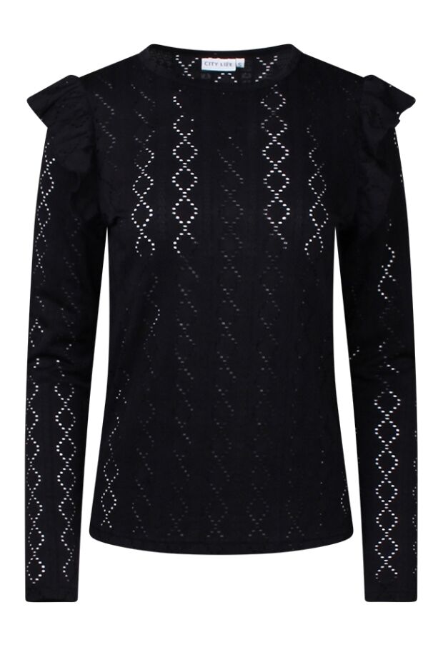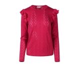 Voeg een vleugje elegantie toe aan je garderobe met deze ajour gebreide top voor dames. Het ontwerp met lange mouwen en een ronde hals zorgt voor een verfijnde uitstraling, terwijl de ruche schouders een speelse, moderne touch geven. Deze top ideaal voor zowel casual als iets chiquer gelegenheden. Combineer met een stijlvolle broek, casual jeans of elegante rok.