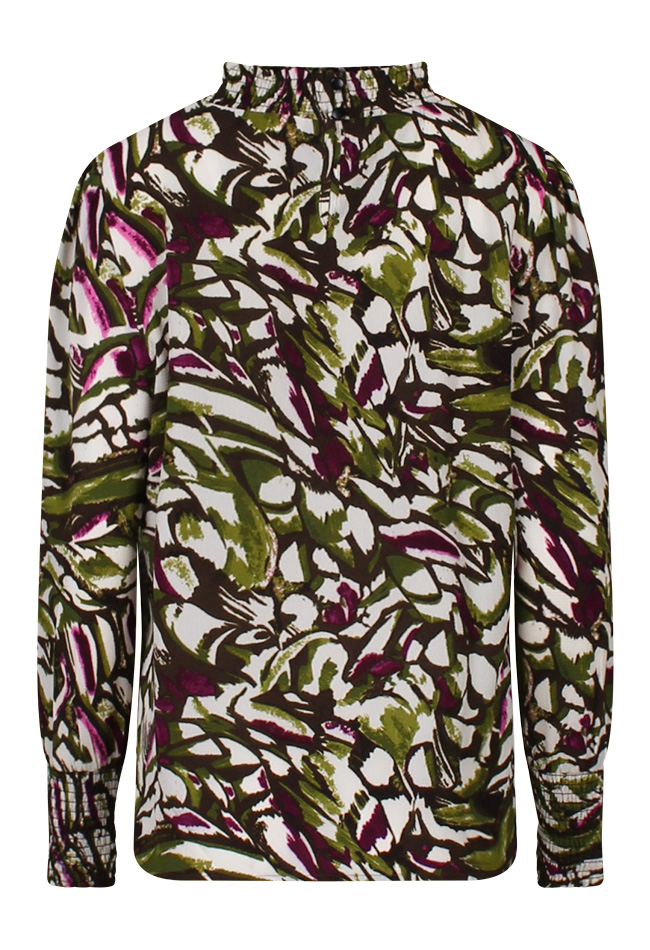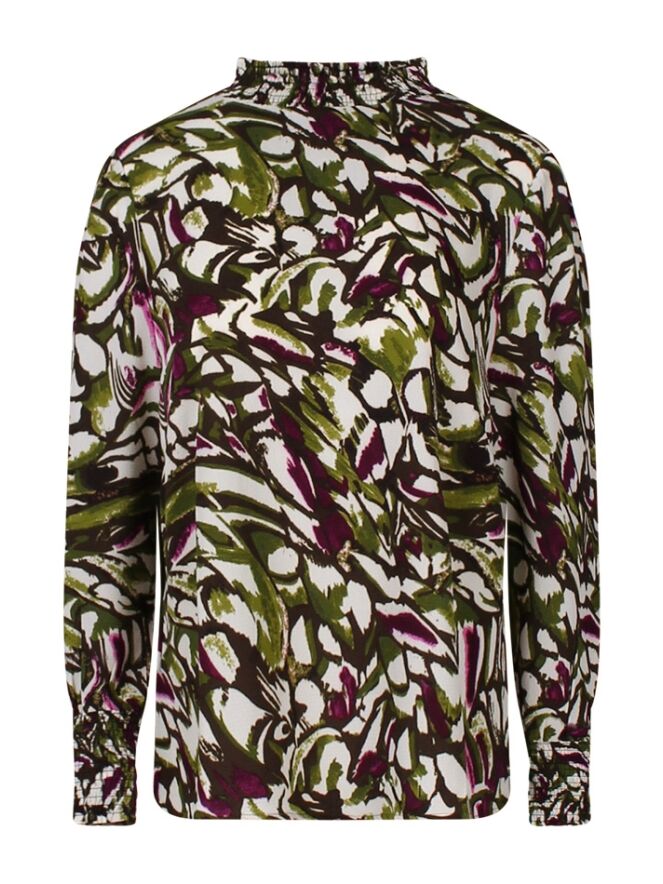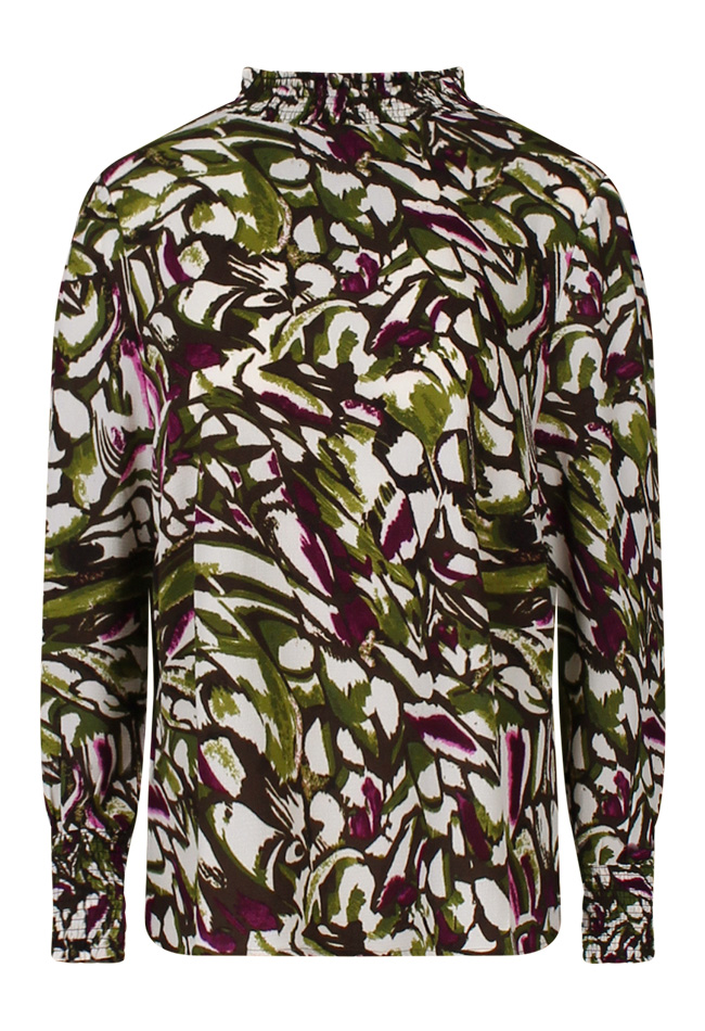 Deze dames top met lange pof mouwen is een echte eyecatcher dankzij het all over dessin en de smockdetails. De smock onder aan de mouwen en de smock turtleneck met twee knoopjes in de nek voegen een elegante en verfijnde touch toe. Combineer met een strakke gecoate broek of wide leg broek voor een stijlvolle en moderne look.