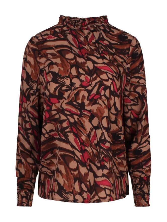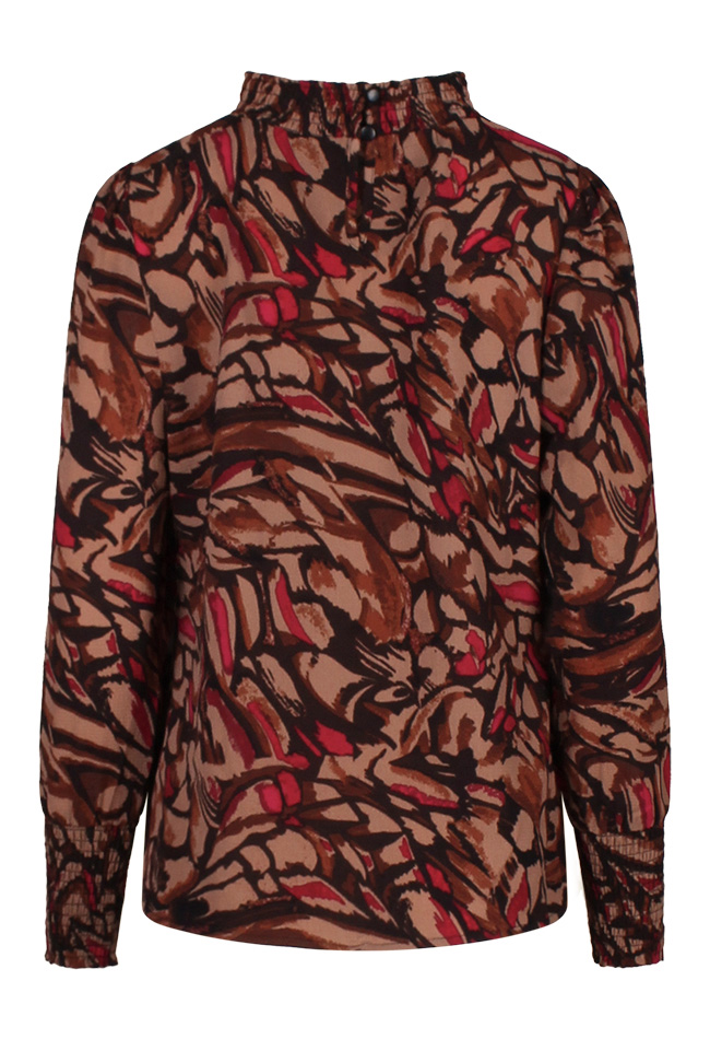 Deze dames top met lange pof mouwen is een echte eyecatcher dankzij het all over dessin en de smockdetails. De smock onder aan de mouwen en de smock turtleneck met twee knoopjes in de nek voegen een elegante en verfijnde touch toe. Combineer met een strakke gecoate broek of wide leg broek voor een stijlvolle en moderne look.