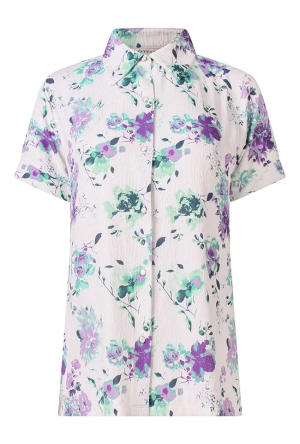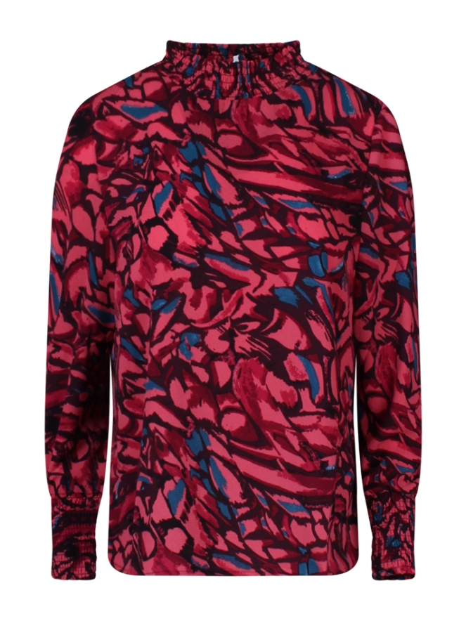 Deze dames top met lange pof mouwen is een echte eyecatcher dankzij het all over dessin en de smockdetails. De smock onder aan de mouwen en de smock turtleneck met twee knoopjes in de nek voegen een elegante en verfijnde touch toe. Combineer met een strakke gecoate broek of wide leg broek voor een stijlvolle en moderne look.