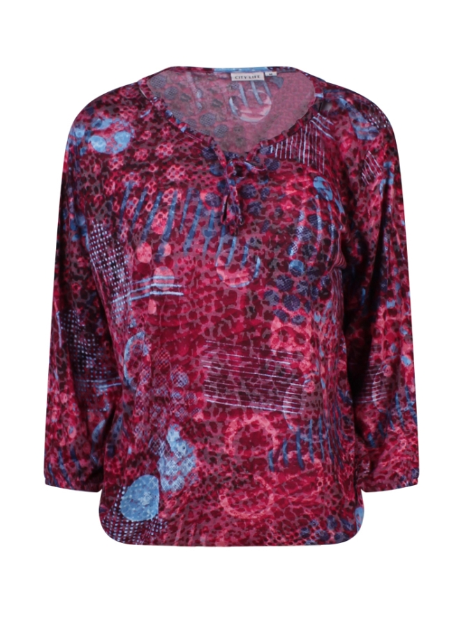 Dit dames T-shirt heeft 3/4 mouwen, een ronde hals met een koordje en strikdetail, en is gemaakt van Ausbrenner stof met een rondjesdessin. Elastiek in de boorden zorgt voor een comfortabele pasvorm.