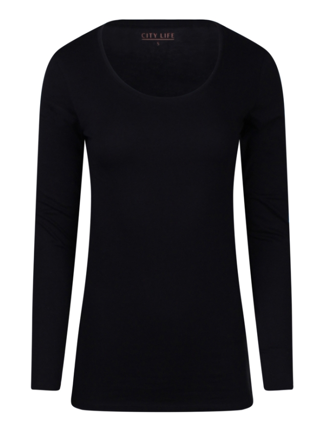 Basic T-shirt met lange mouwen en een diepe ronde hals. Draag het onder een blazer voor een nette casual look. En is het koud? Draag deze basic makkelijk onder je vest of trui. Musthave !