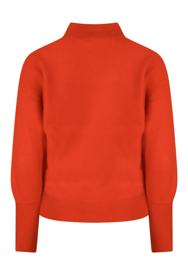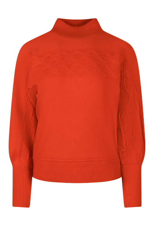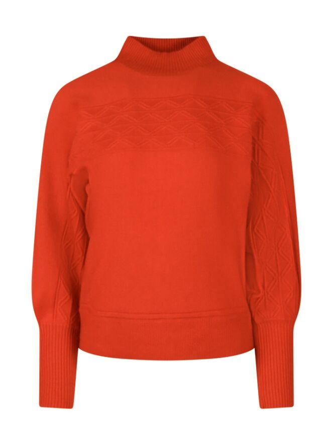 Zachte trui met horizontale kabels over de borst die doorlopen over de armen.