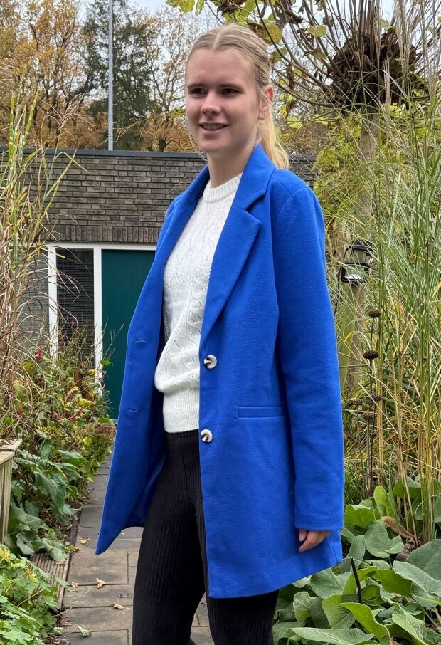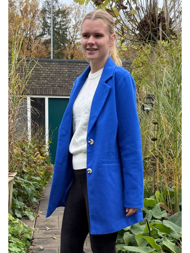 Deze klassieke dames jas heeft een wollook, een reverskraag, en zakken. De knoopsluiting zorgt voor een nette afwerking. Verkrijgbaar in twee opvallende trendy kleuren.
