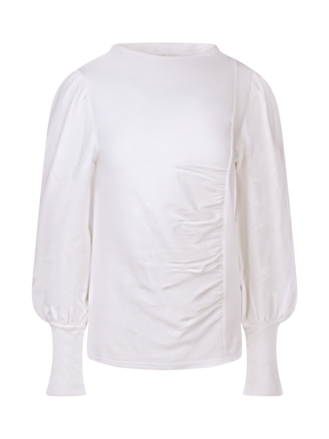 De top met turtleneck en gerimpeld voorpand heeft een pofmouw met lang manchet. De stof waarmee deze top is gemaakt is best dik en heeft fleece aan de binnenkant.