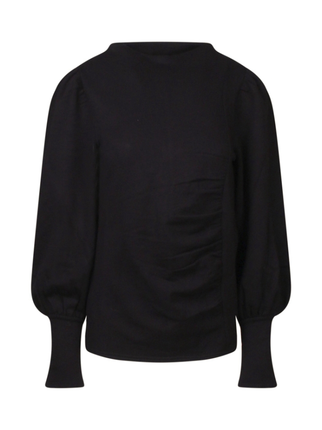 De top met turtleneck en gerimpeld voorpand heeft een pofmouw met lang manchet. De stof waarmee deze top is gemaakt is best dik en heeft fleece aan de binnenkant.