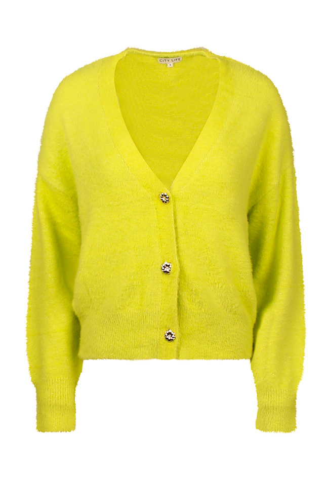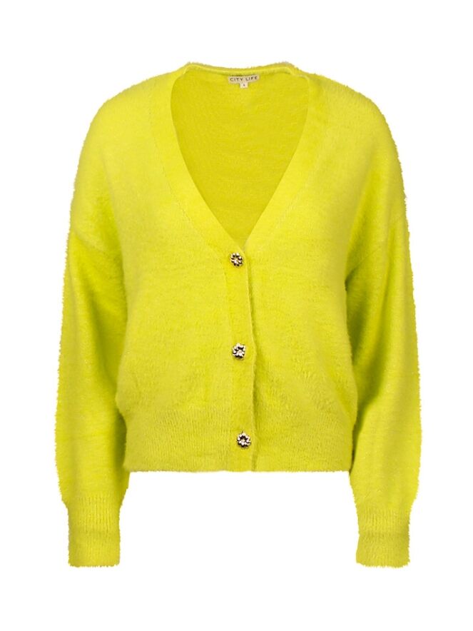 Fraai vestje van City Life met een glittertje en featheryarn wat zorgt voor een pluizig superzacht uiterlijk. Dit vest heeft goudkleurige knopen in bloemvorm. Voor welke kleur ga jij?