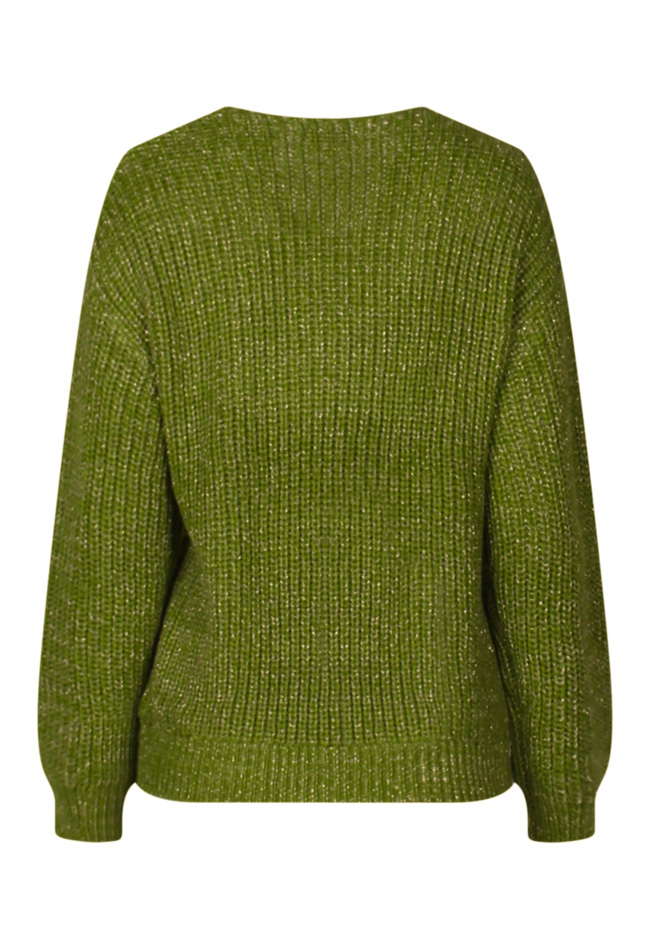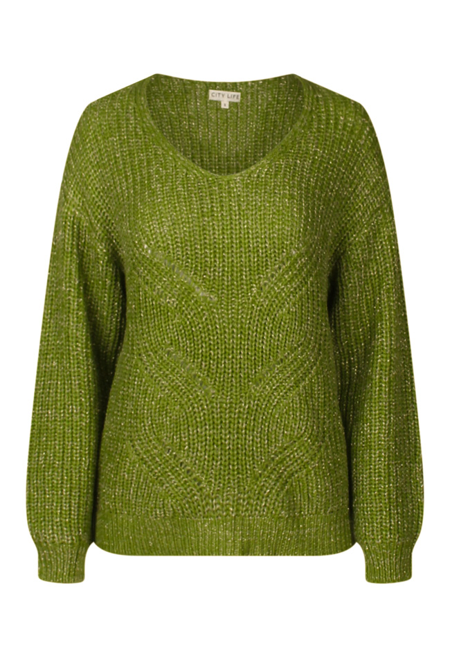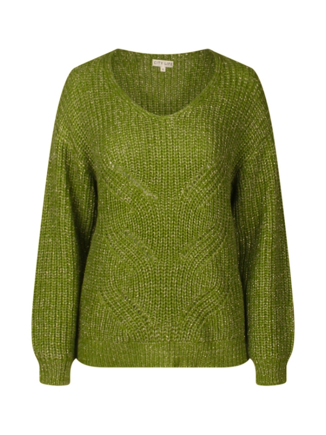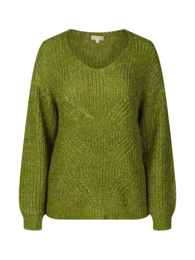 Deze grof gebreide damestrui met groot kabelpatroon aan de voorkant heeft een V hals en een glittertje in de vorm van een ingeweven glitterdraad. Comfortabel en lekker warm voor de wintermaanden. Goed te combineren met een tijdloze jeans of leuke rok.