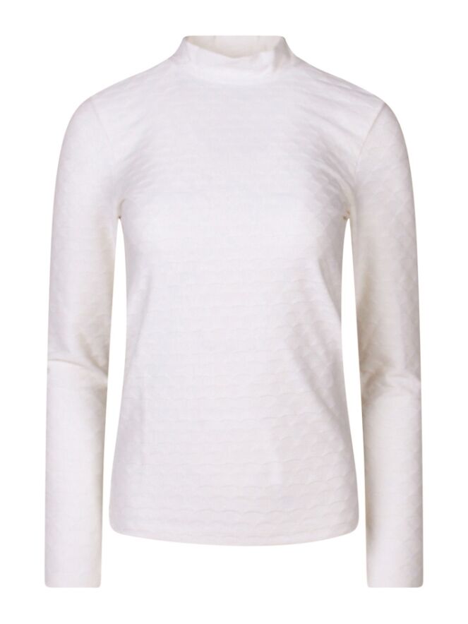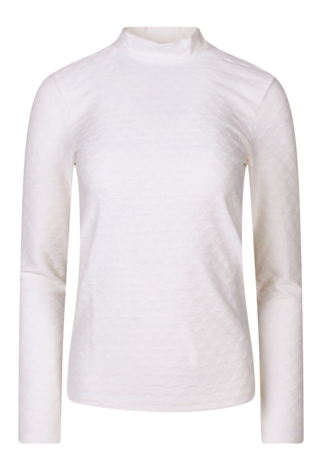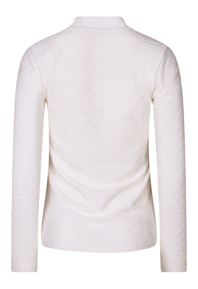 Fraaie top met aansluitende turtleneck. In de stof zit een driehoek patroon wat hem net even anders maakt. Combineer hem met een leuke gilet of draag gewoon warm onder een vest!