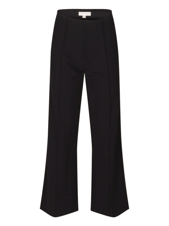 Dunne comfortabele pantalon met een opnaad aan de voorkant en wijde pijpen. Deze broek heeft geen zakken wel een comfortabele elastische tailleband.