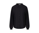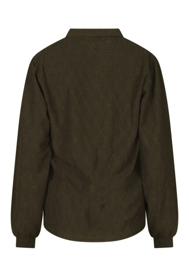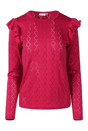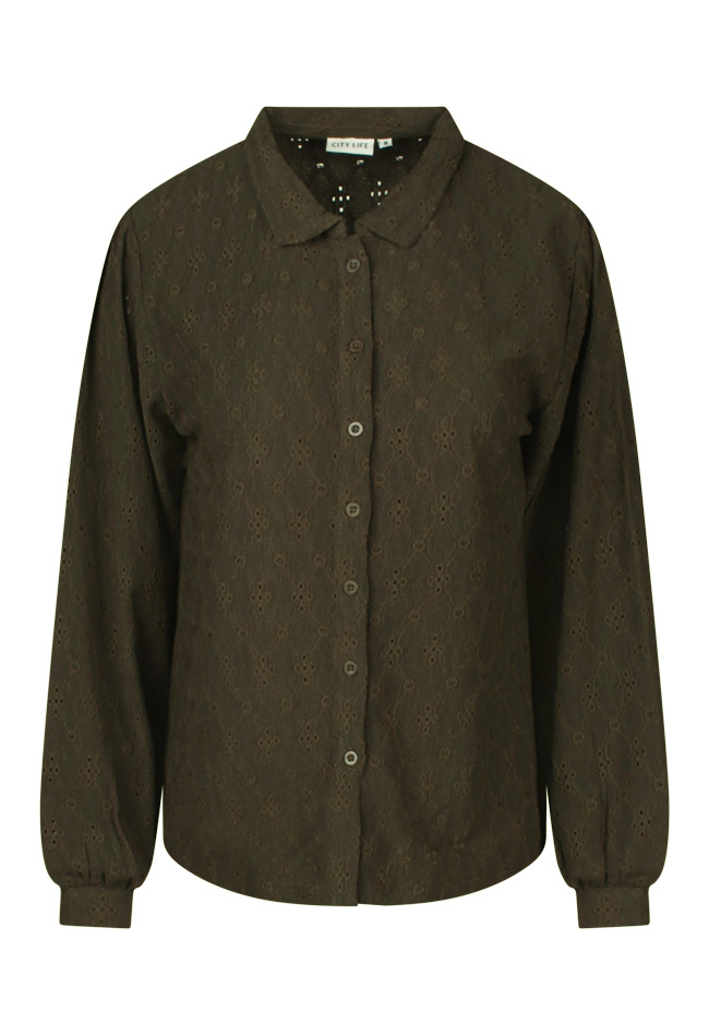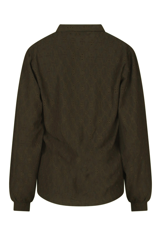Deze dames blouse heeft een klassiek kraagje en is ajour gebreid. Voorzien van een doorknoopsluiting en pofmouwen voor een elegante uitstraling.