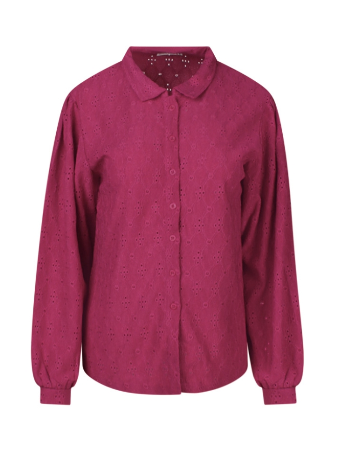Deze dames blouse heeft een klassiek kraagje en is ajour gebreid. Voorzien van een doorknoopsluiting en pofmouwen voor een elegante uitstraling.