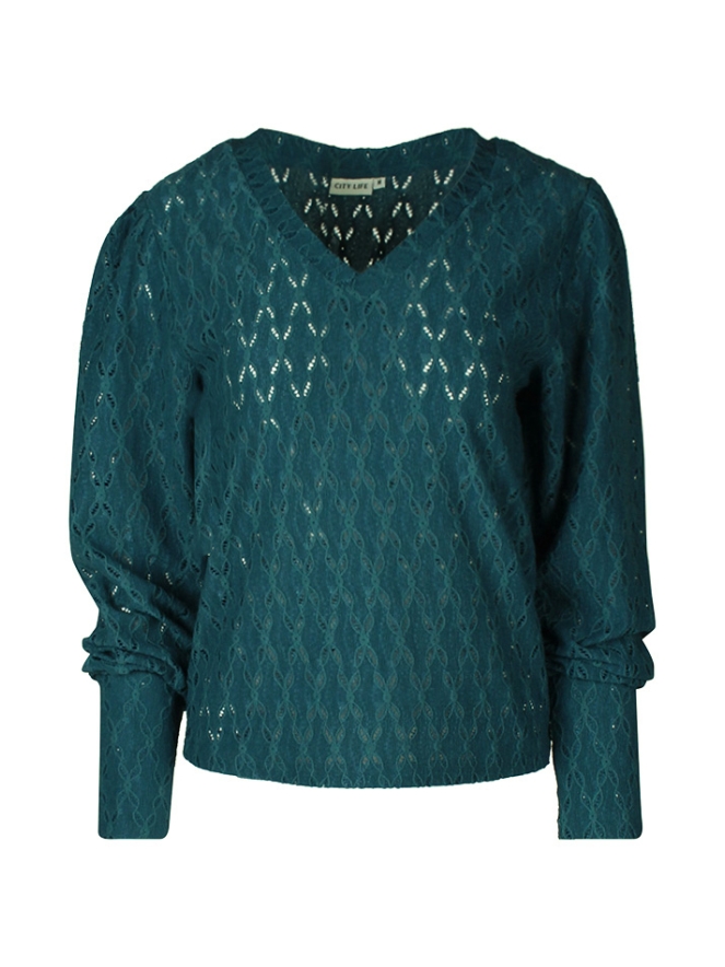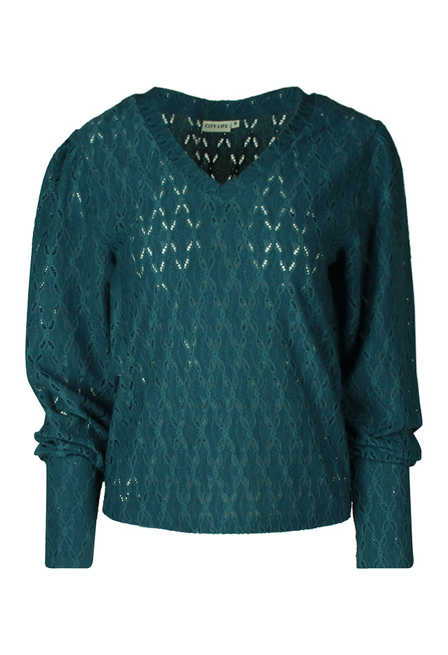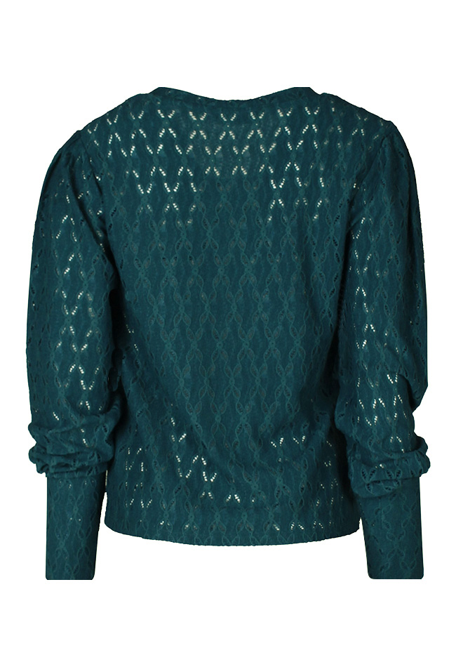 Fraaie top met V hals van ajour. Door de ajour is de stof doorschijnend en wordt het dragen van een shirtje eronder noodzakelijk. De mouwen hebben een lang manchet en poffen op de shouder. Draag het voor een classy look op een nette pantalon met blazer. Hou je meer van casual? Combineer het dan met je favo jeans en boots.