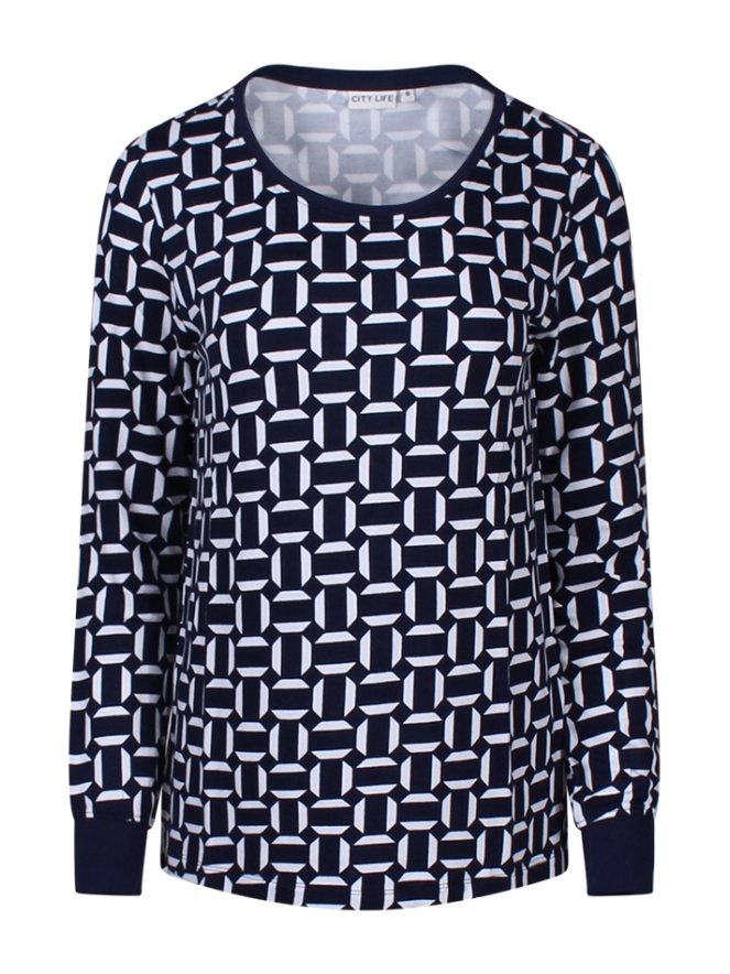 Dunne sweater met grafische print. Je kunt de sweater super leuk combineren met een effen gilet.