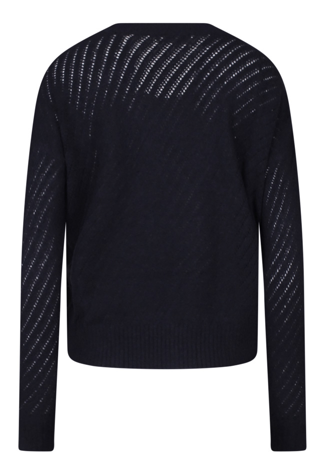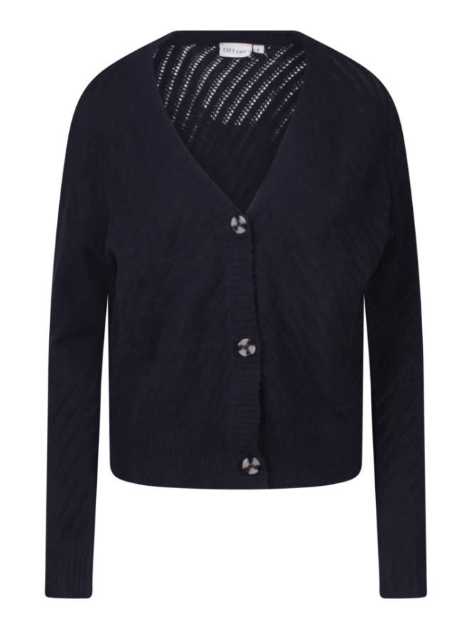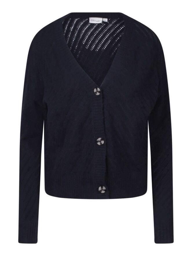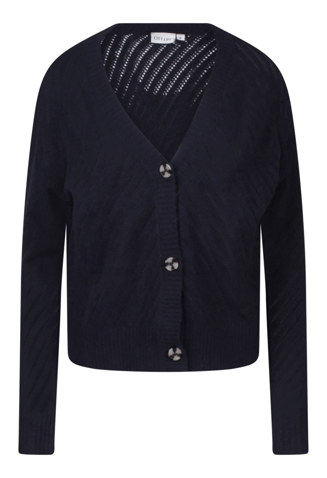 Liefelijk ajour gebreid vestje met knopen. Dit vestje is een kort model en heeft een diagonaal strepen patroon. Tijdloos kledingstuk die het gehele jaar door gedragen kan worden.