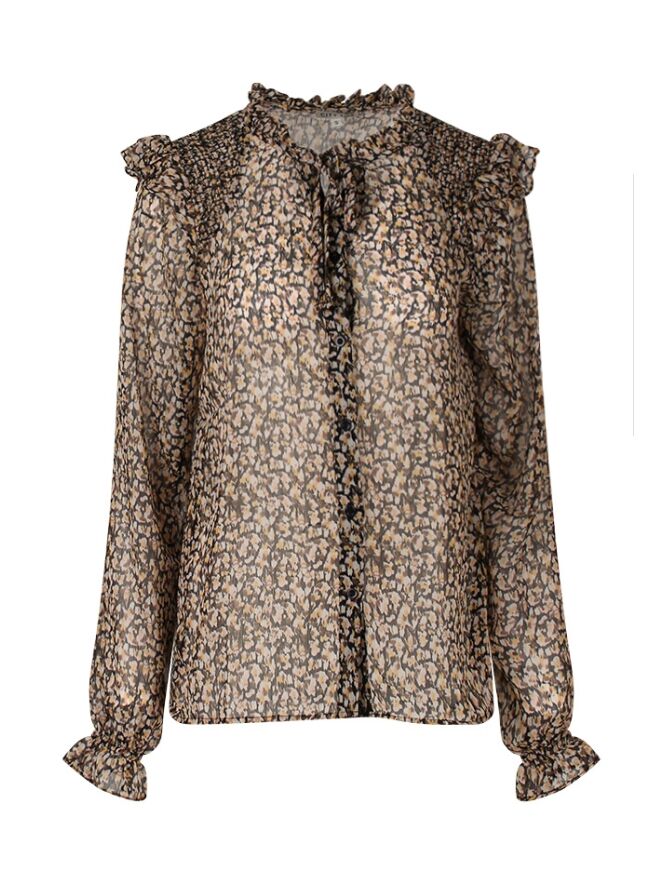 Sierlijke chiffon blouse met smock werk op de schouder. Deze blouse heefte een opvallend kleurrijk vlekkenpatroon met vele details zoals ruches op de schouder, ronde de hals en een kleine V hals welke met een koordje kan worden gesloten of gestrikt. Tijdloos en goed te combineren met jeans, rok of blazer.